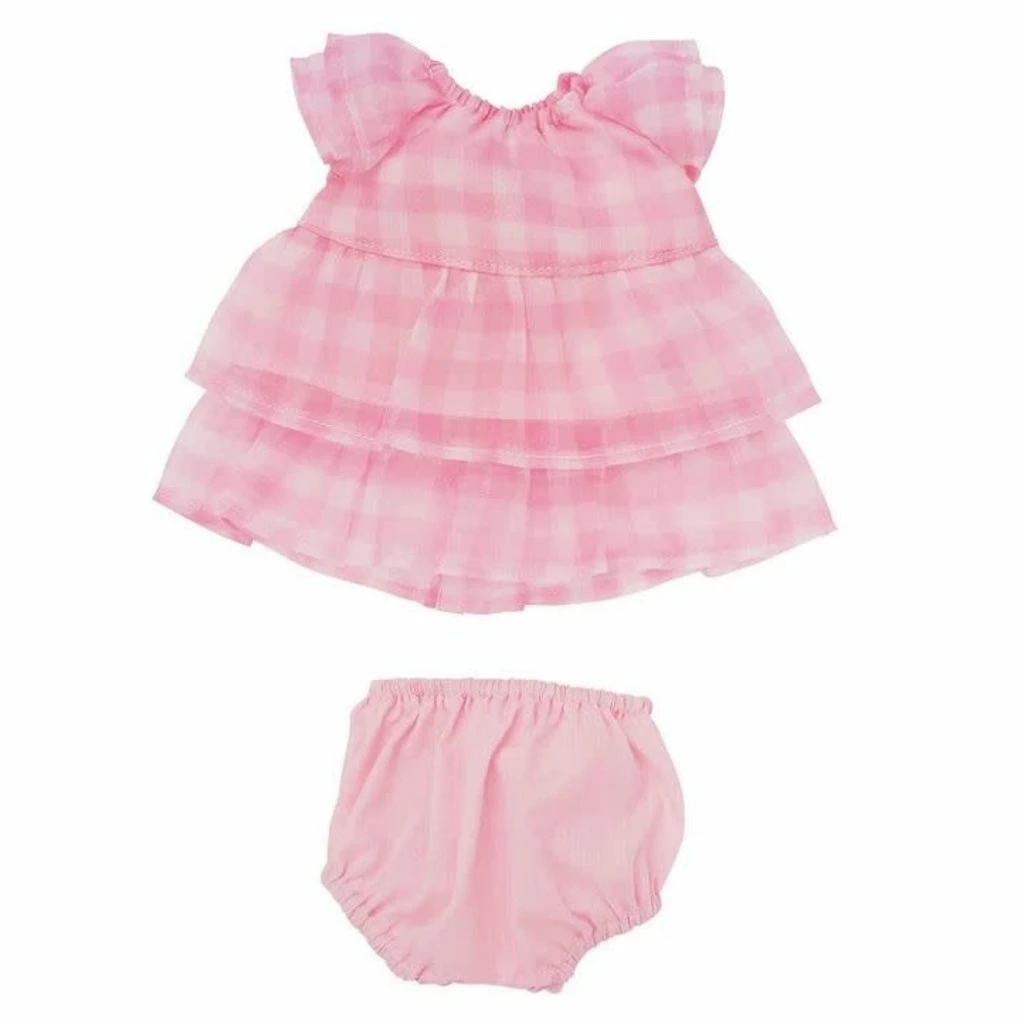 Pretty in Pink – Positively pink and ready for play. This two-piece outfit features a gingham organza tiered dress with flutter sleeves, gathered neck and lined with pink cotton. The dress has a closure on back for easy dressing and undressing. Plus, comes with matching pink cotton bloomers with an elastic waist band.ย