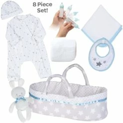 - 8 piece set includes: bassinet, onesie, starry cap, disposable diaper, blanket, bib, bunny doll, and disappearing milk bottle