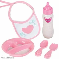 Abracadabra! This magical accessory is a must-have for all baby doll lovers! ADORAβs Magic Feeding Set is a 5-piece set that comes with a magic plate, magic milk, bib, fork and spoon. Add water to the magic plate to reveal strawberries, peas and carrots, and mac & cheese! Your little one will love pretending to βfeedβ their baby doll using the magic plate with food, fork and spoon.