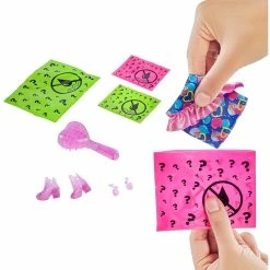 - Each “mystery” package includes one Barbieยฎ Color Revealโข Party doll wearing a color-changing, metallic confetti print and 4 bags containing 1 ruffled skirt in a party-themed print, a pair of shoes, a pair of glitter earrings and a 2-in-1 heart-shaped brush-sponge.