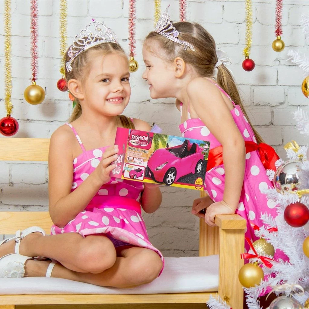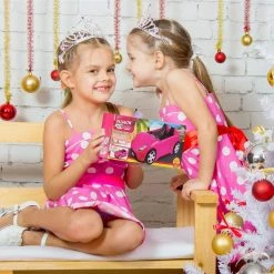 Hit the open road with the Barbie® Convertible—the storytelling possibilities are endless! Designed in sparkly pink with the Barbie® silhouette as hood ornament, the two-seater vehicle is Barbie® signature style. The car’s sporty shape has a spoiler in back and wheels that really roll. The interior is modern in black with realistic upholstery labels and seat belts for the dolls (sold separately).
