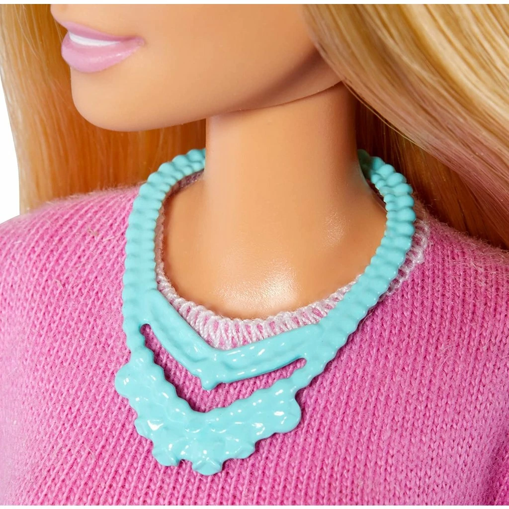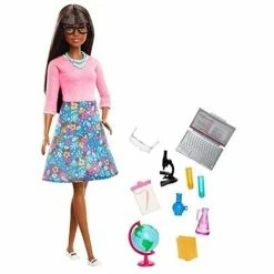 This Barbie™ teacher doll helps her students make the grade with 10 teaching accessories! Explore geography with the spinning globe. Study biology with the microscope. Mix it up in chemistry with two flasks and two beakers. Then record, study and grade it all with the clipboard, book and laptop that opens and closes. Barbie heads the class wearing an outfit that can be accessorized with her glasses or goggles. Explore all the Barbie career dolls and toys to open the door to endless possibilities. Includes Barbie doll wearing fashion and shoes, plus 10 school-themed accessories.