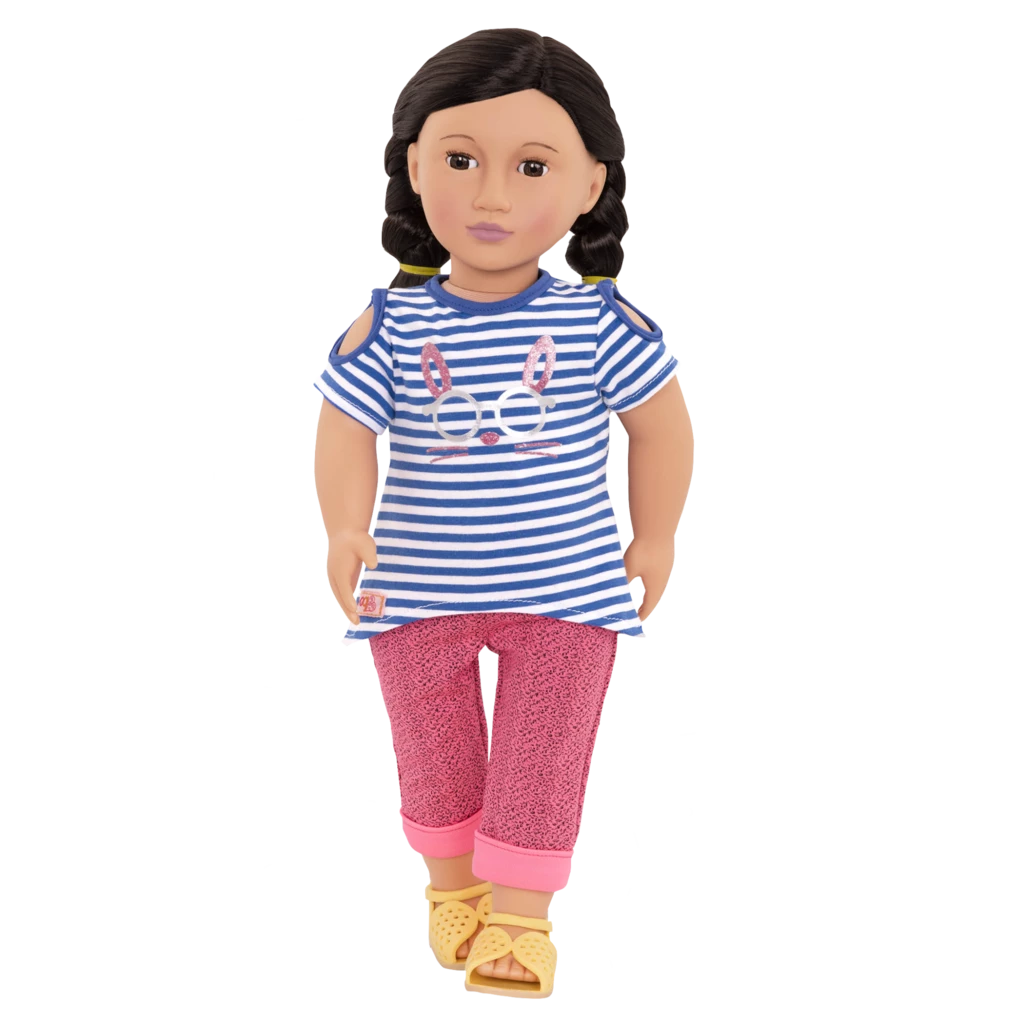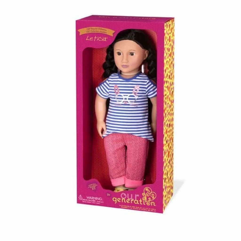 Battat® is a proud supporter of the WE Villages program, an organization admired for its integrity and initiatives to make the world a better place for kids. Through donations from every Our Generation toy sale, we empower children in communities worldwide! LETICIA™ is known for “Walking on sunbeams, chasing my dreams!” She is an 18-inch doll with long, straight dark-brown hair and brown eyes. Leticia comes with a blue and white striped t-shirt with shoulder cut-outs, cartoon bunny print pink pants, 1 pair of undies, and yellow sandals. Your doll lover will have fun brushing and styling her silky nylon hair in lots of different ways!
