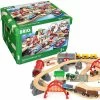 The ultimate BRIOยฎ World railway set, this 106-piece Railway World Deluxe Set features everything you could ever want in a wooden toy train set! Made from a collection of the greatest-hits from the BRIO World railway system, here youโll find all the favorites from our wooden toy world from the Farm to the Airport. This huge set is stored in two handy and sturdy green plastic storage boxes, with shut-close clasps for secure storage.