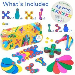 - Clixoยฎ Rainbow Pack includes 39 flexible pieces in 7 unique shapes and 3 cool spinners in a rainbow of colors!