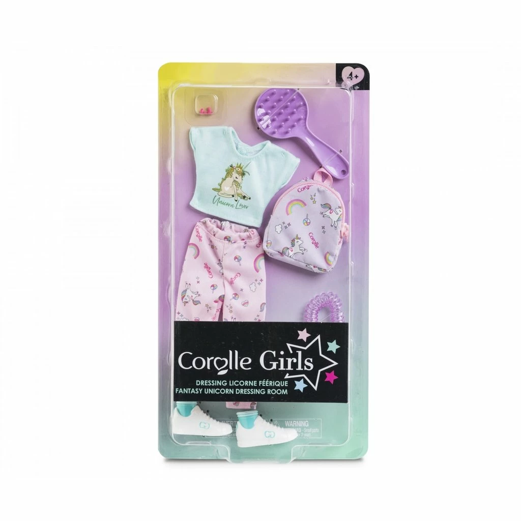 - Fantasy Unicorn Dressing Room set includes 1 hairbrush, 1 spiral hair tie, 1 pair of earrings, 1 T-shirt, 1 pair of leggings, 1 removable pair of sneakers and 1 backpack.