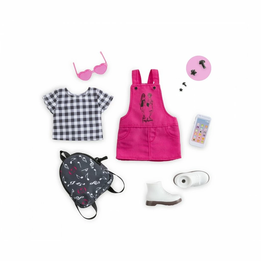 - Music & Fashion Dressing Room set includes 1 pair of sunglasses, 1 pair of earrings, 1 T-shirt, 1 overall dress, 1 removable pair of ankle boots, 1 backpack and 1 smartphone.