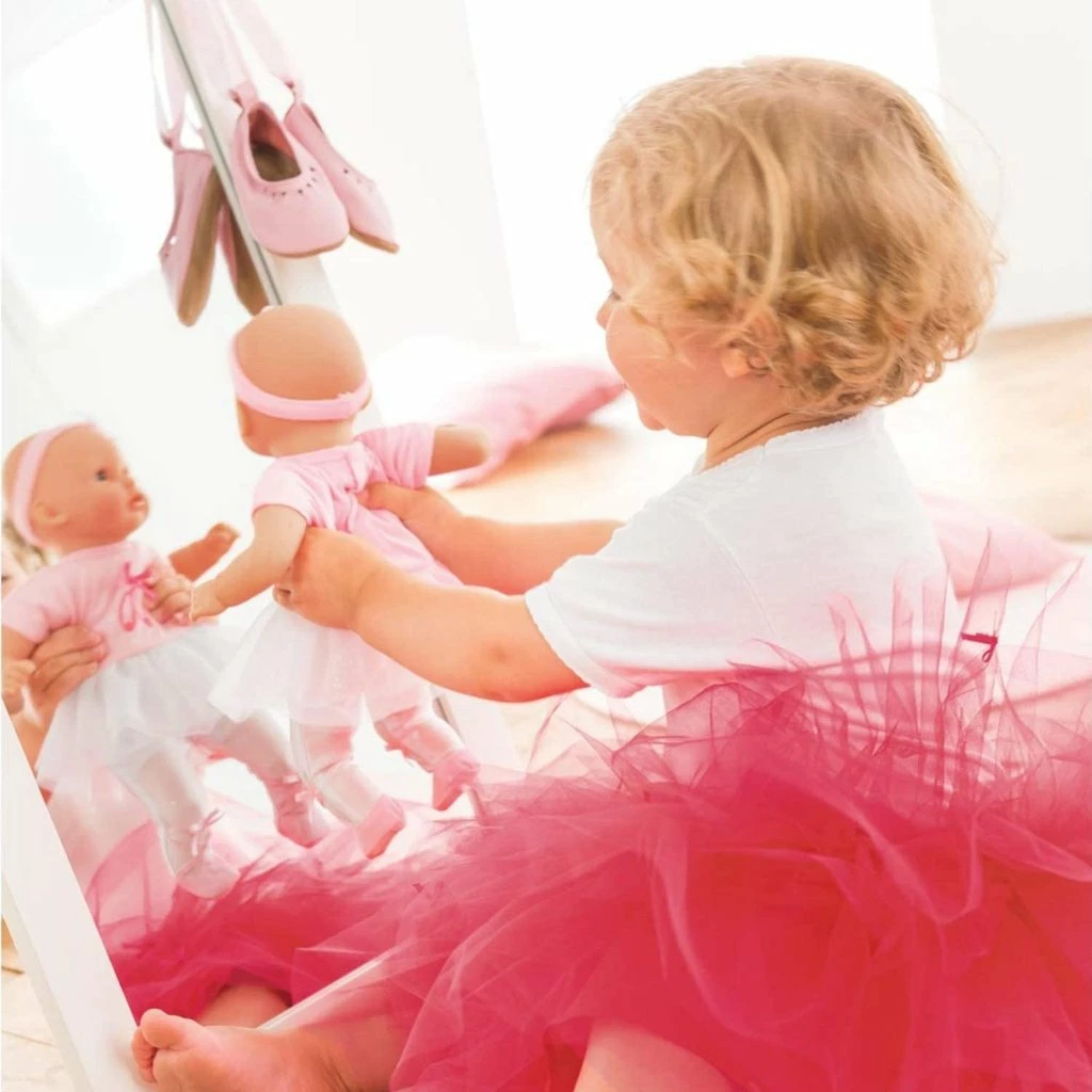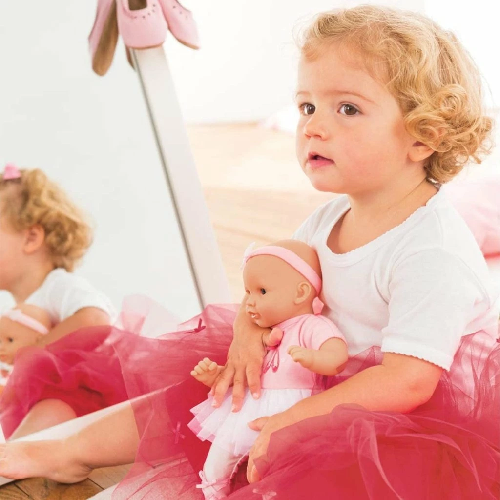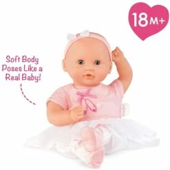 Mon Premier Bรฉbรฉ Calin Ballerina from Corolleยฎ is the ideal first baby doll for the littlest mommies. Its soft beanbag body invites cuddling and can be posed like a real baby for creative pretend play. Designed in France and part of the Mon Premier Collection for ages 18 months and up, this 12-inch baby doll is just the right size to cradle in a young child’s arms. It has soft-to-the-touch, vanilla-scented vinyl skin and open-and-close eyes. Mon Premier Bรฉbรฉ Calin Ballerina wears an all-in-one-piece ballerina fashion that’s easy to put on and take off. She is recital-ready in leotard, tutu, tights and pink slippers with ribbon laces.