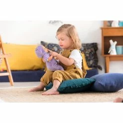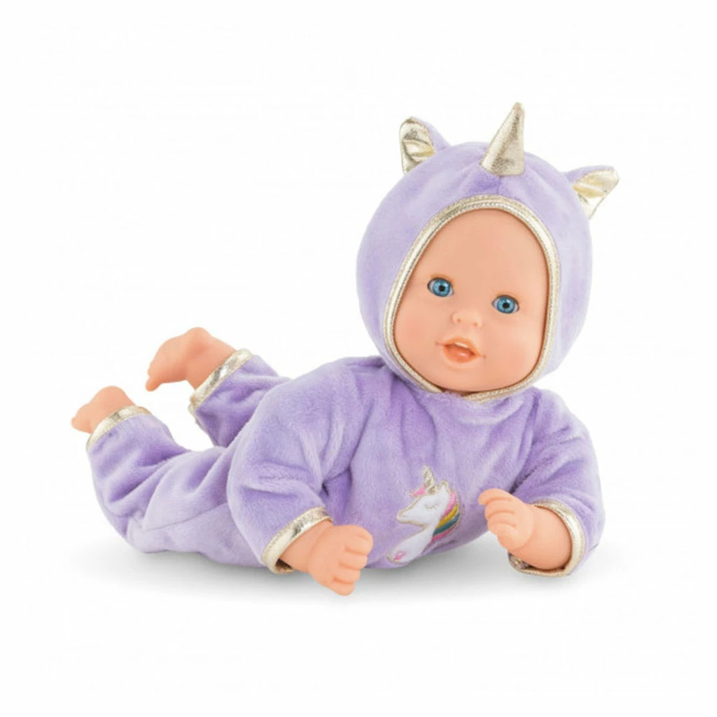 The doll’s head, arms and legs are made of soft-to-the-touch vinyl that is delicately scented with vanilla, a Corolle® signature. Bébé Calin Unicorn is dressed in a purple onesie featuring unicorn embroidery and a hood with a gold horn and two little ears. Bébé Calin Unicorn is part of the mon premier poupon Corolle Collection of dolls, clothing and accessories for beginning doll play.