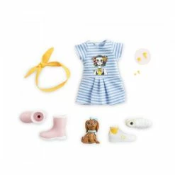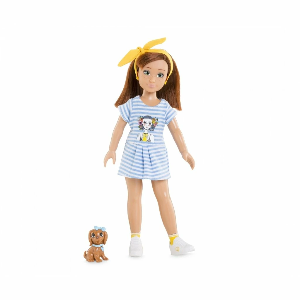 Zoรฉ Nature is a doll with auburn hair and green eyes wearing a blue striped dress and yellow knotted headband. Set includes 1 knotted bow headband, 1 pair of earrings, 1 striped dress, 1 removable pair of sneakers, 1 removable pair of pink rain boots and 1 dog.