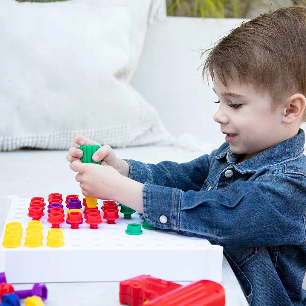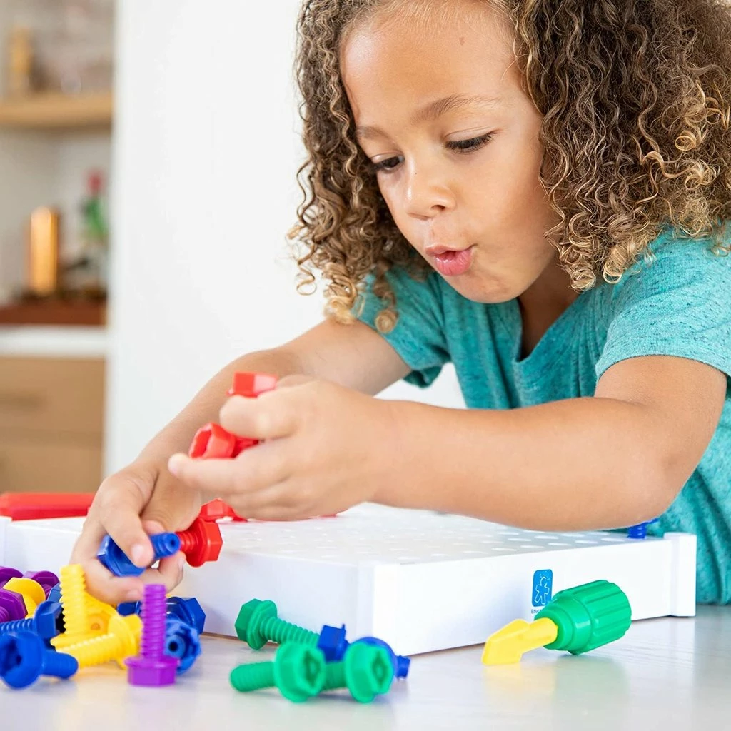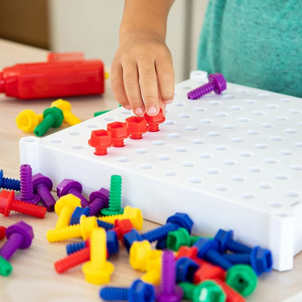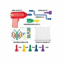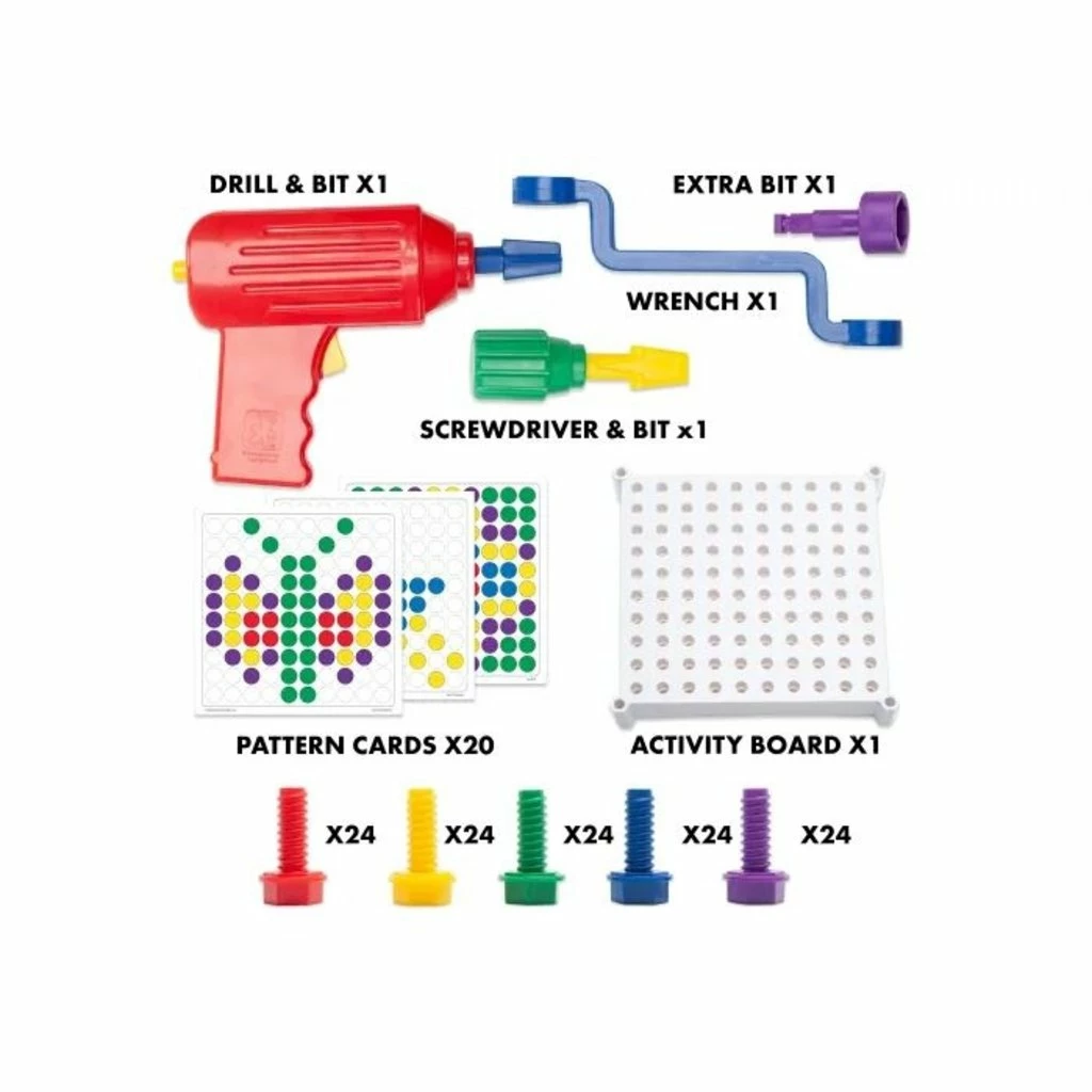 - Includes: 120 Chunky plastic bolts in 5 colors, a reversible power drill, a screwdriver, 3 drill bits (Phillips, socket, flathead), and a combination wrench for tiny hands, as well as 20 Colorful easy-to-follow design activity cards
