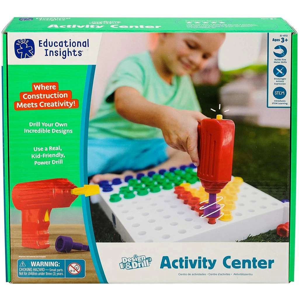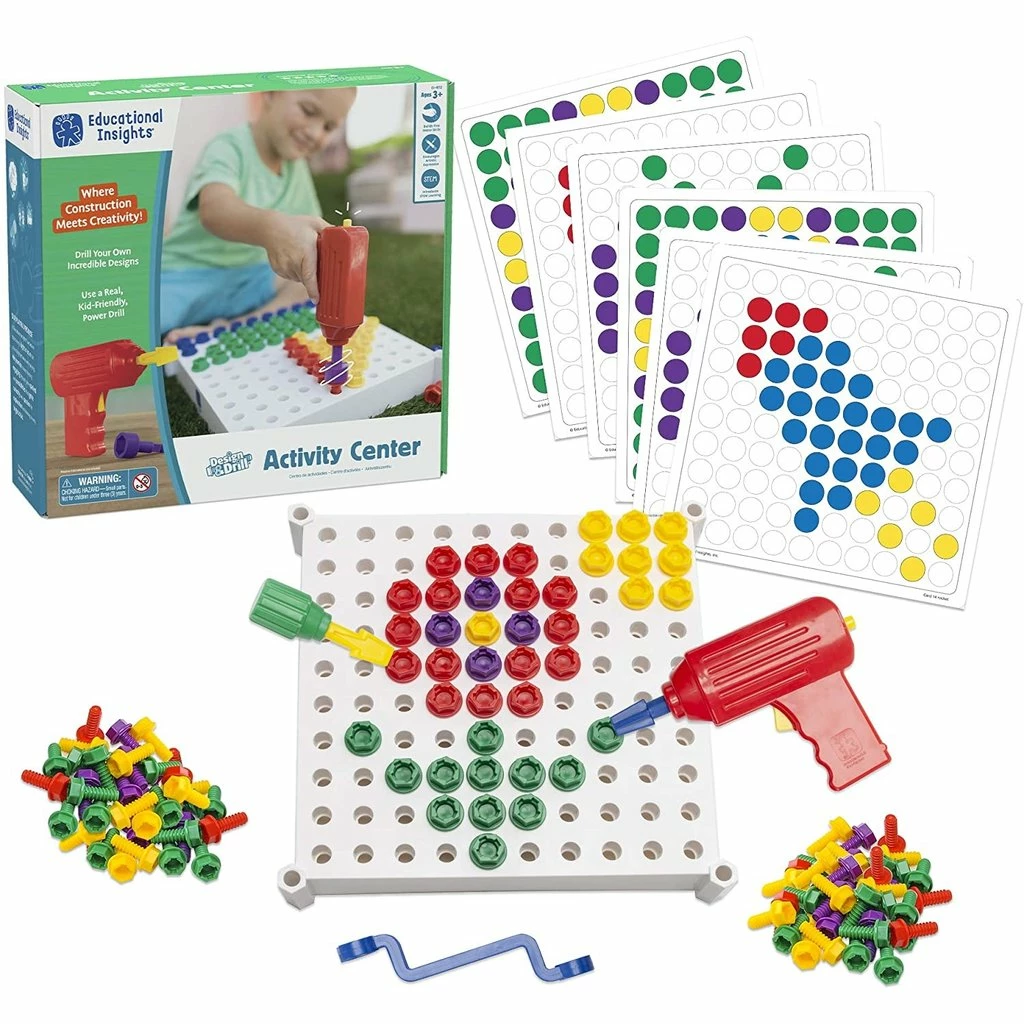 Kids power up their imaginations and build coordination and creative thinking skills as they drill chunky, child-sized components into a sturdy activity board. Children love following the colorful activity cards to create pictures and patterns-from trains and boats to flowers and fish. Young builders can drill their very own designs! Just snap any one of the drill bits into the power drill or the screwdriver handle, grab a handful of bolts, and turn on the learning fun!