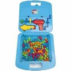 - Includes: 100 regular bolts in 5 assorted colors, 20 fun bolts in 5 shapes and colors, 3 bits (Phillips, socket, and flathead), wrench, hand screwdriver, electronic drill and screwdriver (both require 3 AA batteries, not included), and activity guide with 19 patterns
