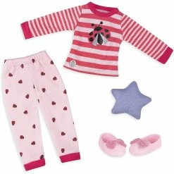 Your doll will fall asleep instantly in her cozy and cute Ladybug Shimmer! pajama set from Glitter Girlsโข! Glitter Girls dolls even look adorably fashionable when going to bed! This 14-inch doll fashion accessory set comes with a cute pajama striped red and pink top with a large sparkly ladybug applique, pink pajama pants with ladybug polka dots, comfortable glitter slippers and a star-shaped pillow for extra sweet dreams!