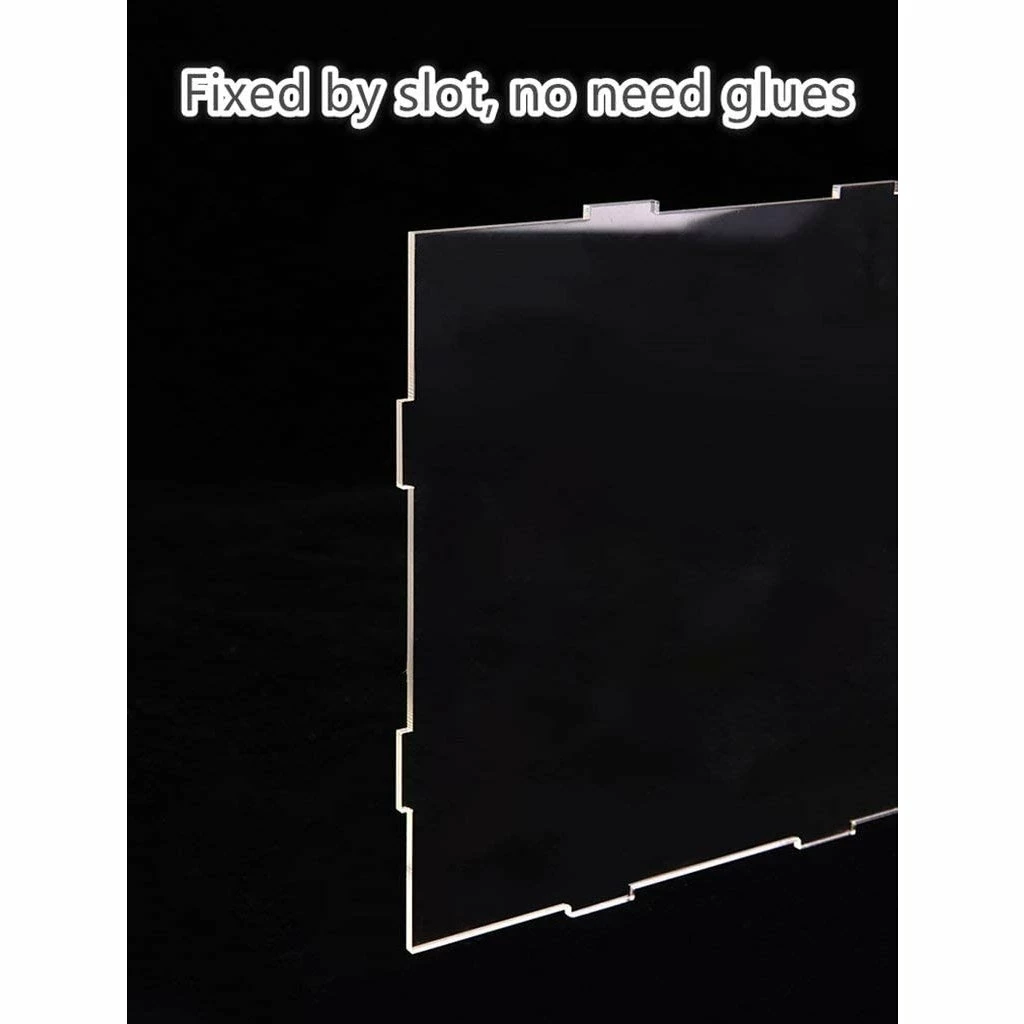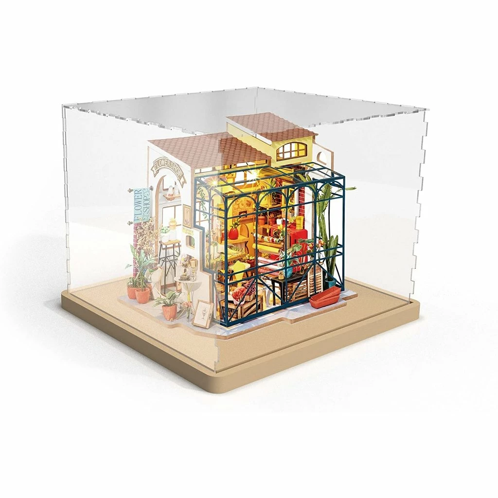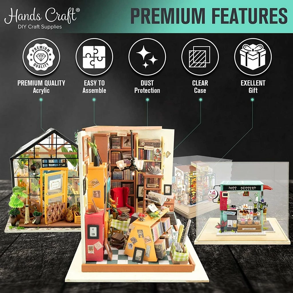An acrylic dust cover case to preserve and protect the longevity and visual appeal of your beautiful miniature house rooms or any creative hobby project. Protects from dust, wind, heat and humidity. Includes 5 pieces of clear acrylic which you assemble. No glue needed โ the acrylic boards are fixed by slot. Assembled dust cover measures 9.7 x 7.9 x 8.5 inches (LxWxH).