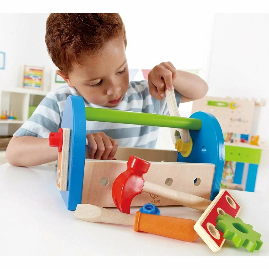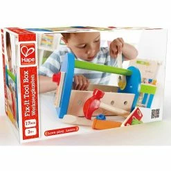 With Hape’s Fix-It Tool Box, your little one can pound to his or her delight and measure and tighten things too! Nuts, bolts, and all the tools little builders need to tinker, are conveniently packed in this ready-for-action box. Name the tools that your child uses. Describe what each does. The tool box was created so that pieces could be attached right on it. Structures can also be made separately.