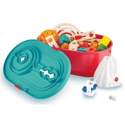 - The HAPE Quadrilla Stack Track Bucket Set wooden marble run comes in a bucket and will let your kid enjoy all the thrills of marble speed racing. Even the bucket becomes part of the track. The bucket lid is a reversible marble track to increase the fun!