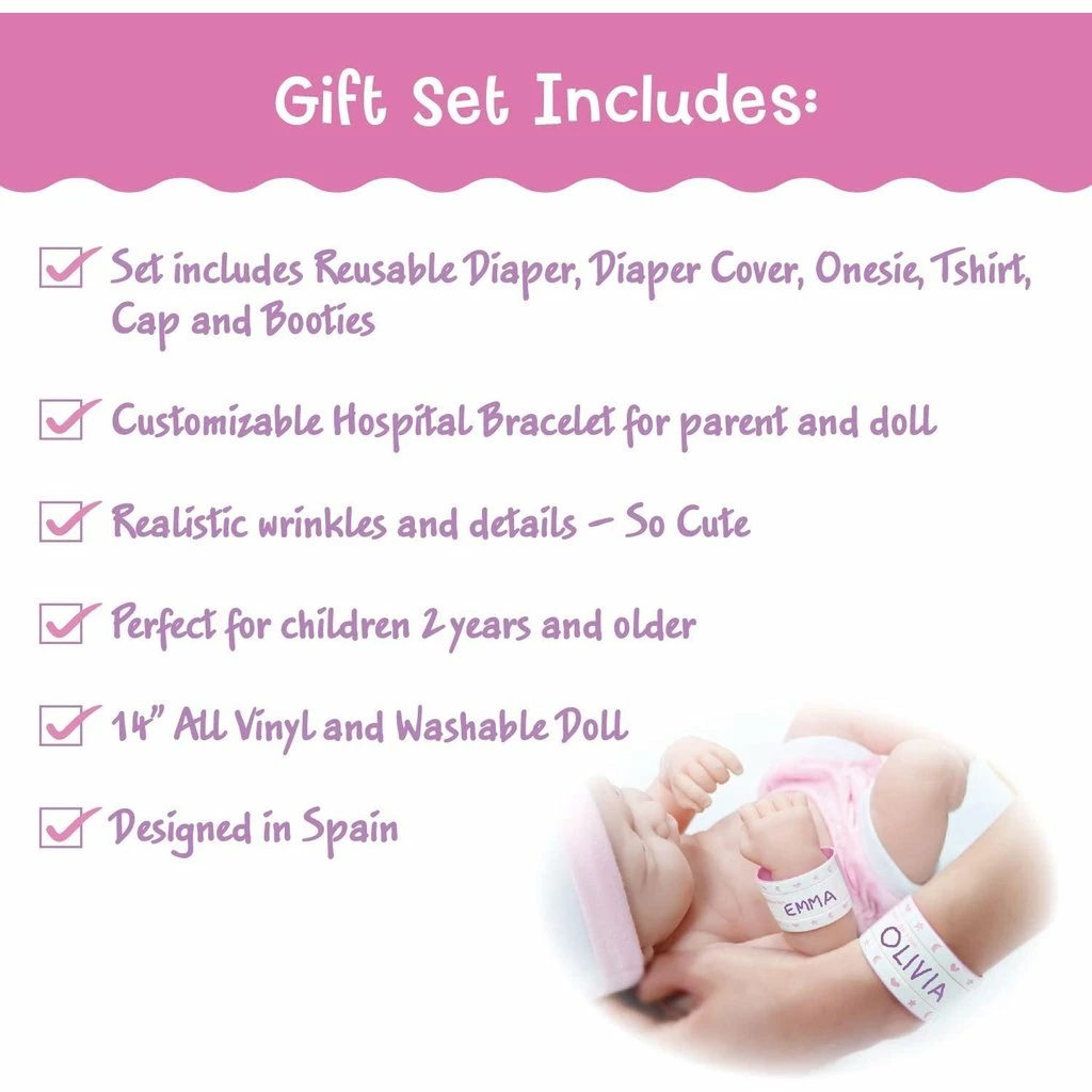 Dolls from the La Newbornยฎ collection represent precious moments in a newbornโs life, like the first tired yawn or tear drop. This La Newbornยฎ baby doll flawlessly imitates that once-in-a-lifetime leaving the hospital experience thanks to her intricately detailed dimples, folds, life-like wrinkles, and 8-piece layette gift set. ย