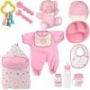 - 8-piece Layette Set for dress-up fun includes short-sleeve bodysuit, short-sleeve t-shirt, pair of booties, hat, cloth diaper, diaper cover, and hospital bracelet.