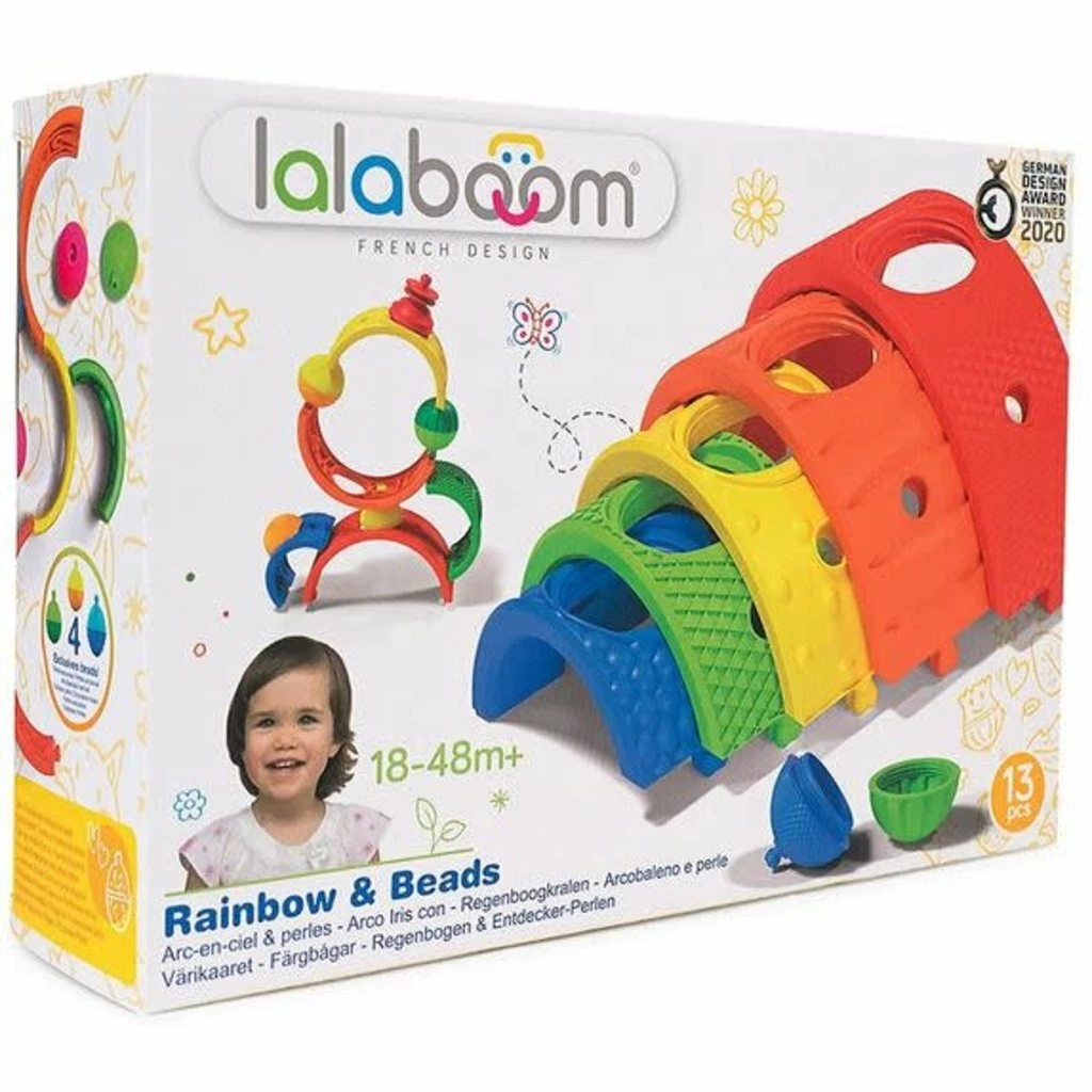 The Lalaboomยฎย Rainbow & Beads offers essential play values for children from 18 months to 4 years old. The universal rainbow figure has colors and textures that stimulate younger users. At an early stage, the arches can be used for basic manipulation such a stacking. Later, kids use the 4 beads included to discover their capacity to build more sophisticated combinations using their creativity and connecting skills. As the arches can spin, the rainbow becomes a balance game which stimulates concentration and fine motor skills. An open-play toy that combines aesthetics and play functions.