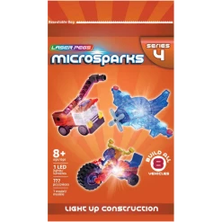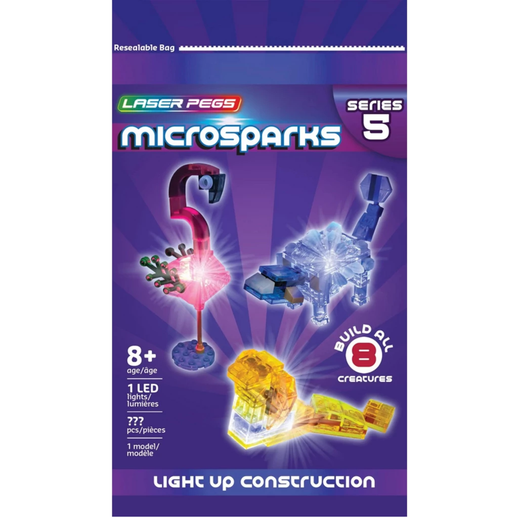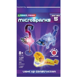 - Each Laser Pegs MicroSparks mystery bag features 1 LED light brick and 30-65 pieces – brick piece count varies; batteries included.