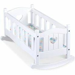 Rock to sleep favorite dolls and stuffed animals in this realistic and classically styled wooden Play Cradle designed by toy makers Melissa & Doug! Made to fit dolls up to 20 inches tall, the durable white rocking cradle with a wipe-clean surface stands approximately 10 inches tall. Clear instructions make the cradle easy to assemble with just a screwdriver (not included).ย Dolls and their accesories encourage empathy and help kids express themselves as they explore grown-up roles and responsibilities. A child’s confidence and self-esteem blossom and grow with each nurturing moment of imaginative play!