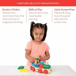 All aboard for playtime and learning excitement! The solid wood Stacking Train combines the benefits and fun of block play with toddlersโ love of trains and things that move. The 15 brightly colored wooden blocks come in red, yellow, green and blue. Holes in the multi-shaped blocks allow kids to stack them in various ways on wooden dowels built into the three wheeled, train carsโor they can stack, sort, and play with the blocks on their own. Train cars can be linked together or played with individually, adding even more exciting playtime options. This versatile train is designed with the thoughtfulness that you expect from Melissa & Doug products, allowing kids to build, stack, and rollโand to build developmental skills, too!
