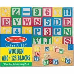 These Wooden ABC & 123 Building Blocks provide endless hours of building, balancing, counting, comparing, and all kinds of hands-on early learning! Each of the 50 traditionally-styled classic wood blocks are carved and then painted on two sides with capital letters, numbers, and mathematical symbols; the other sides are stamped with letters and numbers, as well as line drawings of easy to recognize pictures! The 1″ blocks are sanded smooth, making them comfortable for small hands to grasp, stack, sort and build. The set stores neatly in the included cloth bag so kids can take block play anywhere! This set of Wooden ABC & 123 Blocks designed by Melissa & Doug lets kids build towers—and developmental skills, too!