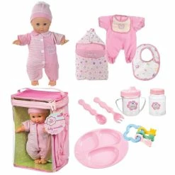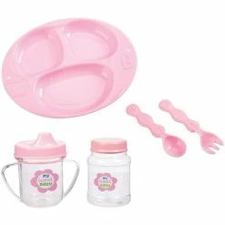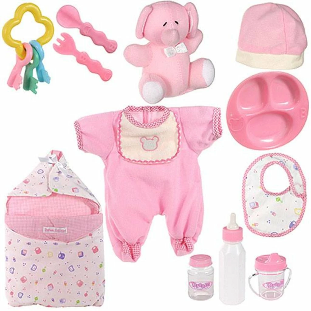 - Accessories include 2 outfitsโromper with matching hat, and sleeper with matching hat; bottle; sippy cup; baby food jar; spoon; fork; three-section plate; bib; sleeping bag; and key rattle